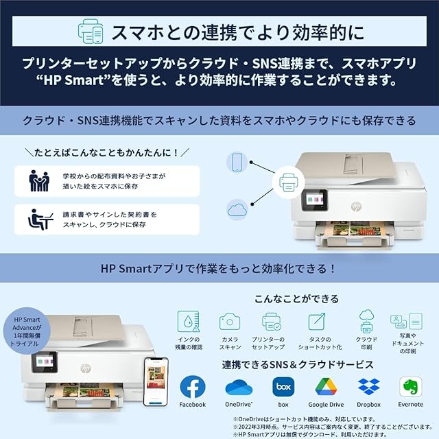 【Wi-Fi関連機能】接続の中断をなるべく減らすデュアルバンドWi-Fi対応。Wi-Fi Direct機能により、パソコン、スマートフォン、またはタブレットを直接接続し、ワイヤレスで印刷することができます。高い生産性を実現するHP Smart アプリの、HP Smart Advanceに対応。スマホを使ったモバイルファクスの送信・複数アイテムスキャン・書籍スキャン(自動補正対応)・テキスト