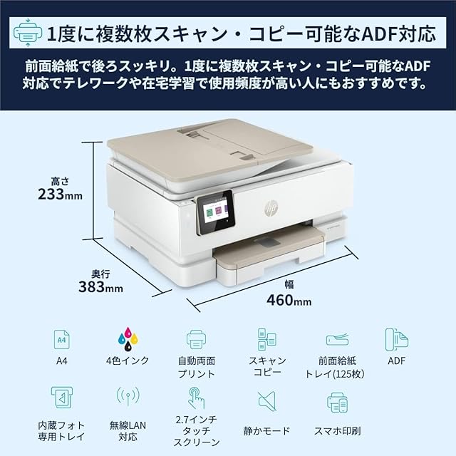 ENVY Inspire 7920は、ENVY Inspire 7220(サンドベージュ)にADF(自動原稿送り装置)を搭載した、スキャンを中心に利用したい方に便利なモデルです。一度に最大35枚読み取り、複数枚原稿を自動で連続コピー・スキャンできます。 【特徴1】インテリアに馴染むおしゃれなデザイン スタイリッシュなバイカラーを採用。どんなインテリアにも馴染む上品で優美なデザインに仕上げました。マットな素材採用で、指紋がつきにくい加工がされているのでお手入れもラクチンです。【特徴2】写真も年賀状も文書も、キレイで見やすい! 黒は文字がにじみにくい顔料インクでくっきりはっきりとカラーは鮮やか。