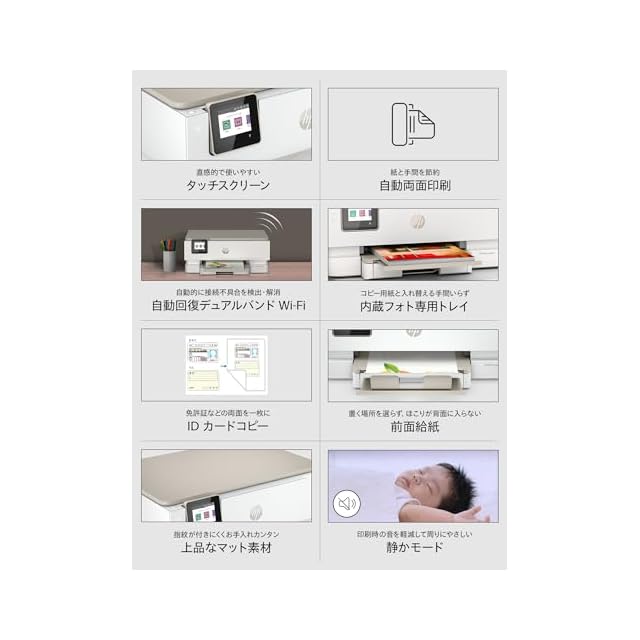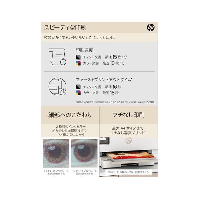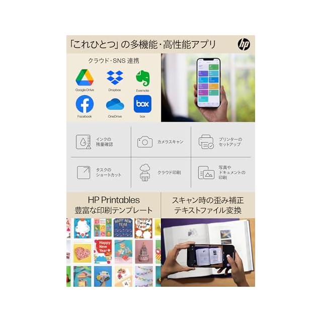 【Wi-Fi関連機能】接続の中断をなるべく減らすデュアルバンドWi-Fi対応。Wi-Fi Direct機能により、パソコン、スマートフォン、またはタブレットを直接接続し、ワイヤレスで印刷することができます。高い生産性を実現するHP Smart アプリの、HP Smart Advanceに対応。スマホを使ったモバイルファクスの送信・複数アイテムスキャン・書籍スキャン(自動補正対応)・テキスト認識機