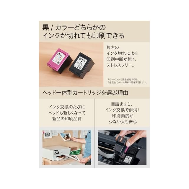 その他のポイント:静かモード / シングルカートリッジモード(黒かカラーどちらかのインクが切れても印刷可能) / 2.7型液晶(カラータッチスクリーン)/ スキャン / スマホ印刷 / 内蔵フォト専用トレイ(普通紙とフォト用紙を同時にセット可能) / 自動両面印刷 / フチなしプリント(最大A4サイズまでの写真をフチなしプリント対応)/ 前面給紙(普通紙125枚
