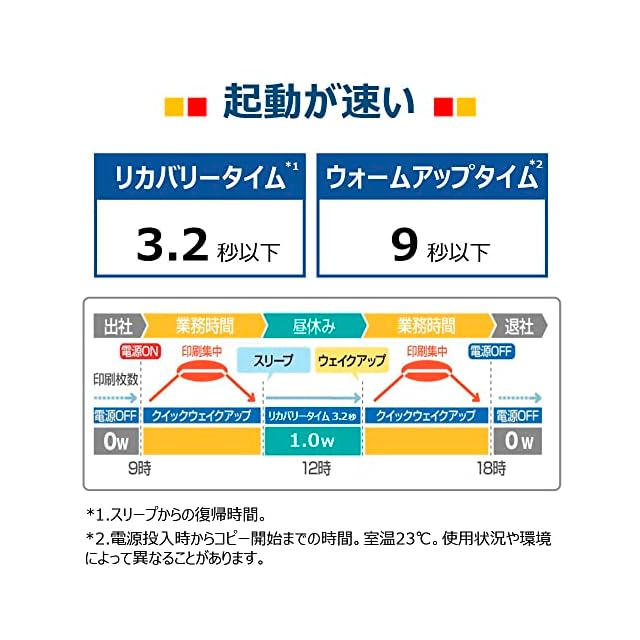 A4毎分23枚(A4片面等倍時。普通紙、同一データを連続印刷した場合の速度)ファーストコピー9秒以下