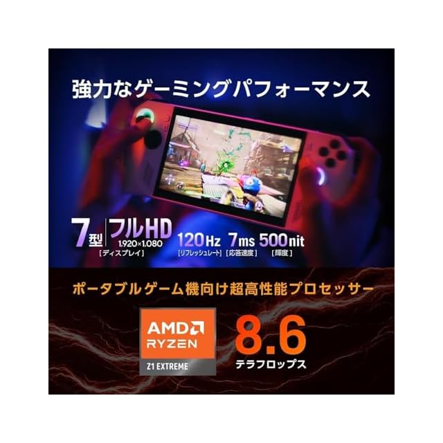 【ディスプレイ】7.0型ワイドTFTカラー液晶、グレア、1,920×1,080ドット (リフレッシュレート : 120Hz)【CPU】AMD Ryzen Z1 Extreme プロセッサー【メモリ】16GB LPDDR5-6400 【スロット】オンボードメモリのみ【ストレージ】512GB (PCI Express 4.0 x4接続)【タッチパネル】搭載【ポインティングデバイス】10点マルチタッチ・タッチスクリーン (静電容量方式)