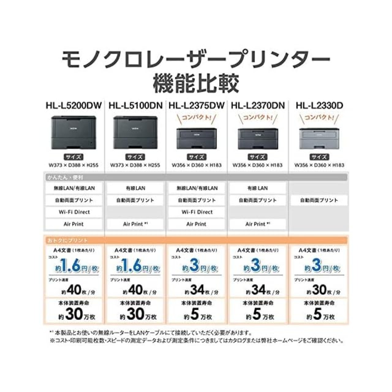 消費電力:印刷時:約420W、ピーク時:880W以下、スタンバイ時:約39.5W、スリープ時:約0.8W。ウォームアップタイム:9.5秒以下(スリープモードから)、27秒以下(電源投入から)