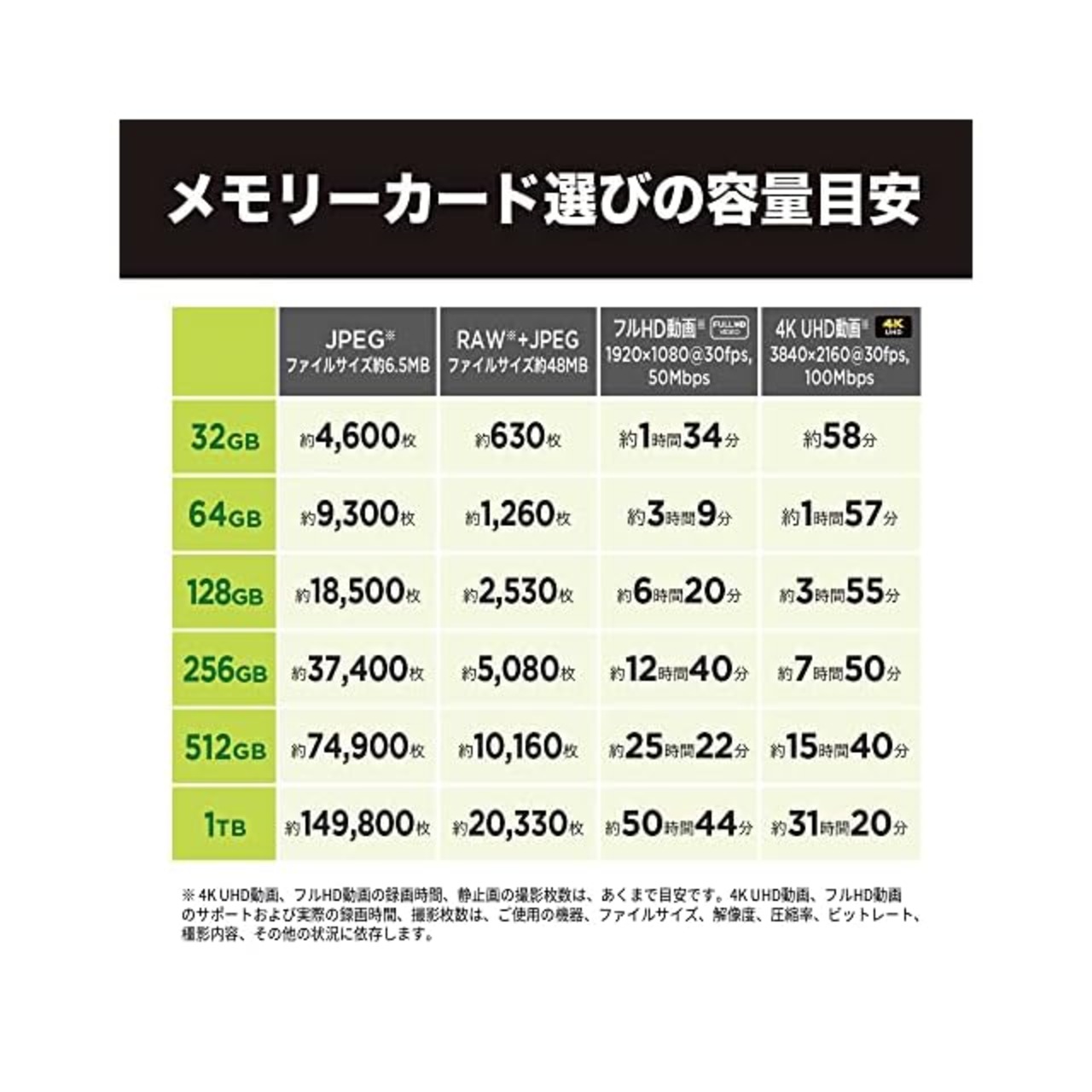 "中断なく長時間撮影:最大512GB1の大容量で、カードの交換やデータのオフロードをすることなく、60 fpsで撮影した4K UHDビデオ3を最大352分、30 fpsで撮影した8Kビデオ3を最大286分保存できます。5 3 4K UHD(3840x2160)および8K(7680x4320)ビデオのサポートについては、ご使用の機器、ファイルサイズ、解像度、圧縮率、ビットレート、撮影内容、その他の状況に依存します。 5 使用の目安:実際の数値は、ファイルのサイズ、解像度、圧縮、ビットレート、コンテンツ、ホスト機器、あらかじめ読み込まれているファイル数、その他の要素により異なります。"