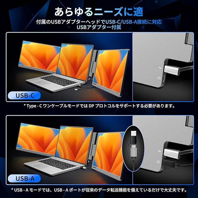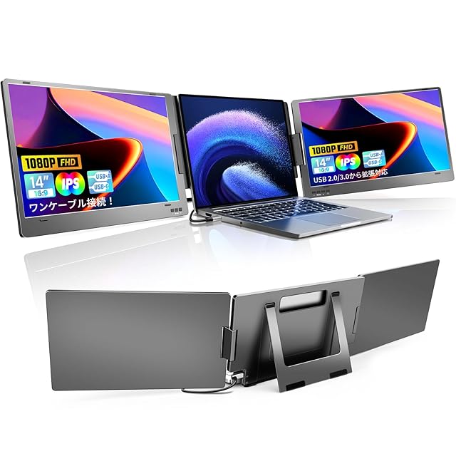 ROADOM デュアルモニター 14インチ モバイルトリプルモニター Type-C ケーブル1本接続/USB2.0から拡張対応 11.6~15.6インチノートパソコン用 3画面 360°回転 アルミ合金製 折りたたみ式 デュアルディスプレイ FHD1080P IPSパネル Win/Mac/Android対応【X90A】