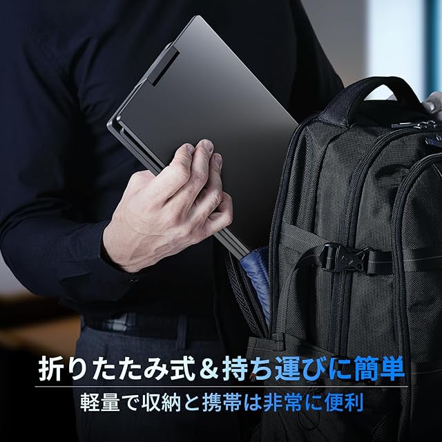 【独立型デザイン、持ち運びが簡単】このトリプルモニターは、ノートパソコンをモニターに取り付ける必要がなく、伸縮式スタンドモデルよりも日常的に使いやすい革新的な独立型デザインを採用しています。また、30°-90°の角度調節が可能なキックスタンドが付属しており、お好みの角度に調節することができます。折りたたみ式なので、ブリーフケースやバックパックに入れて簡単に収納できます。