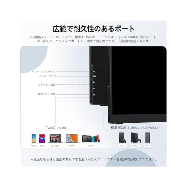 【USB Type-Cケーブル1本で接続&効率2倍】このポータブルモニターには2つの全機能USB Type-Cポートが搭載されており、スマホやPCをUSB Type-Cケーブル一本で簡単に接続するだけで画面が表示されます。特別なドライブや電源を必要とせず、標準的なHDMIポートもあわせて搭載されています。効率的に仕事を処理し、一度に複数のタスクを処理できます。例えば、メールを確認しながら文書編集や、インターネットでの資料検索と同時にメモを取ることができます。*注意:使用中のデバイスのUSB Type-CポートはDisplayPort Altモードをサポートしている必要があります。もしディスプレイの輝度や音量が低い場合は、15W以上の電源アダプターを使用して電力を供給してください。(アダプターは付属品に含まれません)