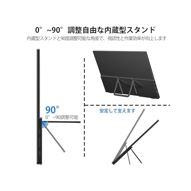 【自立スタンド付き・壁掛けに対応】自立スタンドで0°~90°の角度を自由に調整でき、十分な固定力で安心。大角度での倒れる心配もありません。縦置き時も一定の角度を保ち、倒れるリスクを最小限に。さらに、底部の滑り止めゴムが安定性を更に高めます。付属の保護バッグはモニターを保管し、使用後に保護することができ、持ち運びにも便利です。壁掛け穴の規格(75*75mm)に対応しているため、モニターアームを活用してより省スペースな設置も可能です。小さいスペースでも最善な配置が見つかります。