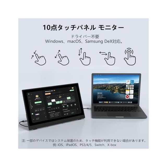 【多機種に対応&マルチタッチ】ノートパソコン、デスクトップPC、スマホ、PS3/PS4/PS5、Xbox One、Wii、Nintendo Switchなど多機種に対応しています。タッチパネル ポータブル ディスプレイは、鮮やかな IPS タッチスクリーン ディスプレイを備えています。マルチタッチ機能搭載で、操作がもっと便利になる!マルチタッチ機能によりマウスとキーボードなどに面倒な接続を避け、プレゼンの時、ワーク効率を向上します。