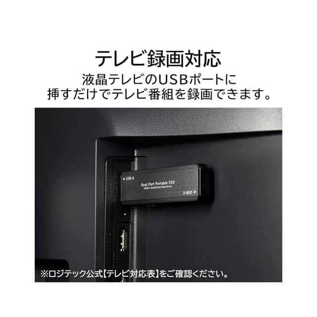 液晶テレビのUSBポートに挿すだけでテレビ番組を録画できます。配線や電源アダプタも必要ないため、壁掛けや狭いスペースへの設置に適しています。 ※テレビに接続する場合はテレビ側の仕様及びポート幅をご確認ください。 ※SSDの特性(書換寿命)により、全録やチャンネル録画等のタイムシフト視聴には適しておりません。