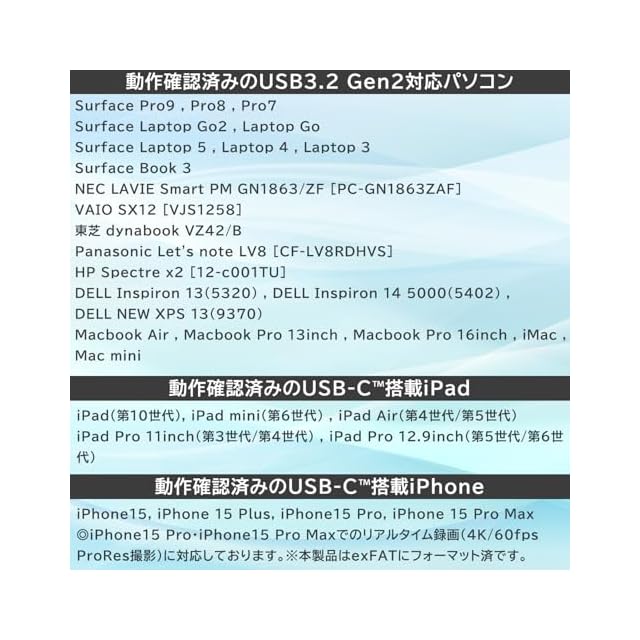 従来モデルよりグレードアップした内蔵SSDを採用したことで、読み込み最大1,000MB/s、書き込み最大700MB/sを実現。USB3.2 Gen2の性能を最大限発揮することができ、大量の画像ファイルや4K動画などの大容量ファイルをストレスなく転送できます。Windows、MACパソコンの他にゲーム機にもお使いいただけます。 ※USB3.2 Gen2の性能を発揮するには、PC側もUSB3.2 Gen2転送に対応している必要があります。 ※USB3.2(Gen1)/USB3.1(Gen1)/USB3.0に接続した場合5Gbps(理論値)となります。 ※比較製品(USBメモリ:ロジテックLMC-64GU3シリーズ/ポータブルHDD:ロジテックLHD-PBMBU3QWシリーズ/ポータブルSSD:ロジテックLMD-PBLU3BKシリーズ) ※弊社テスト環境での実測値です[ベンチマークソフト] CrysrtalDiskMark8.0.4 シーケンシャルリードの実測値