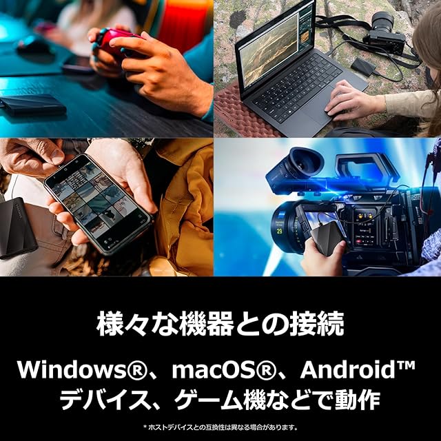 使用用途:シネマカメラ(Blackmagic Pocket Cinema Camera 4K,6K,6K G2,6K Pro,URSA Mini Pro 12K,Broadcast G2推奨ドライブ)、スタジオカメラ(Blackmagic Studio Camera 6K Pro,4K Plus, 4K Pro, 4K Pro G2推奨ドライブ)、デジタル一眼カメラ(Panasonic LUMIX GH6/S5Ⅱx推奨ドライブ)、デジタル一眼カメラ(Panasonic LUMIX DC-G9M2/GH6/S5Ⅱx推奨ドライブ)、iPhone 15 シリーズ動作確認済み、PC(個人用、ビジネス)、スマートフォン、PS4、PS5等