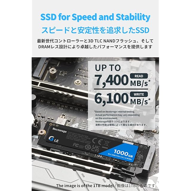 【製品仕様】Nextorage Gシリーズ 内蔵SSD 1TB 最大転送速度(シーケンシャル):読み出し7,300MB/s 書き込み: 6,000MB/s インターフェース:NVMe (PCIe Gen4 x 4), フォームファクタ:M.2 2280 NANDフラッシュ:3D TLC TBW (書き込み耐性):1000TB
