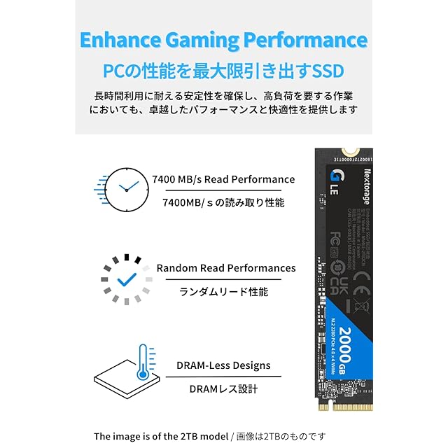 【製品仕様】Nextorage Gシリーズ 内蔵SSD 2TB 最大転送速度(シーケンシャル):読み出し7,300MB/s 書き込み: 6,900MB/s インターフェース:NVMe (PCIe Gen4 x 4), フォームファクタ:M.2 2280 NANDフラッシュ:3D TLC TBW (書き込み耐性):2400TB