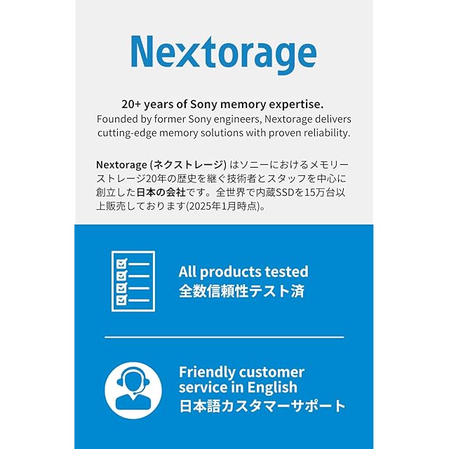 【ソニーの歴史を継ぐ日本メーカー】Nextorageはソニーにおけるメモリーストレージ20年の歴史を継ぐ技術者とスタッフを中心に創立した日本の会社です。全世界で内蔵SSDを15万台以上販売しております(2025年1月時点)