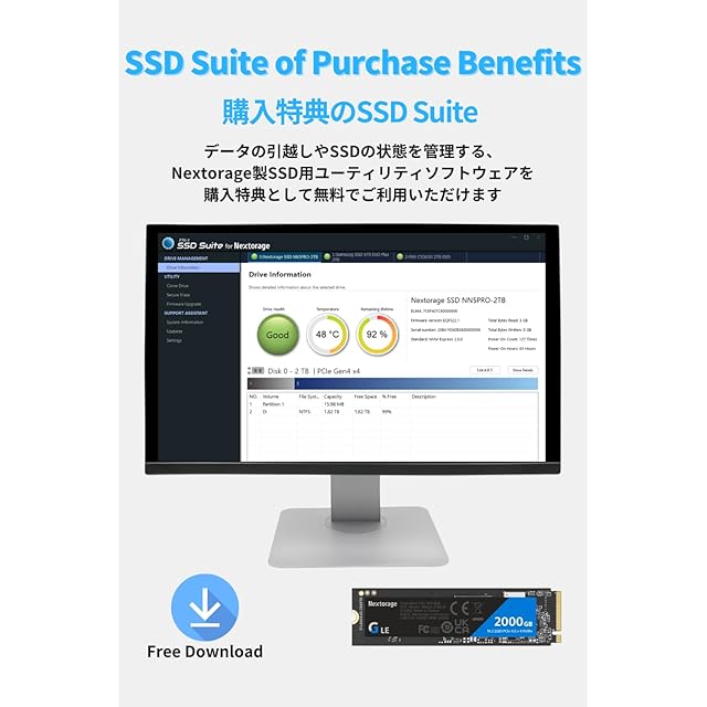 【パッケージ内容】Gシリーズ LE 内蔵SSD、日本語カスタマーサポート、 SSD Suite for Nextorage(ダウンロード)