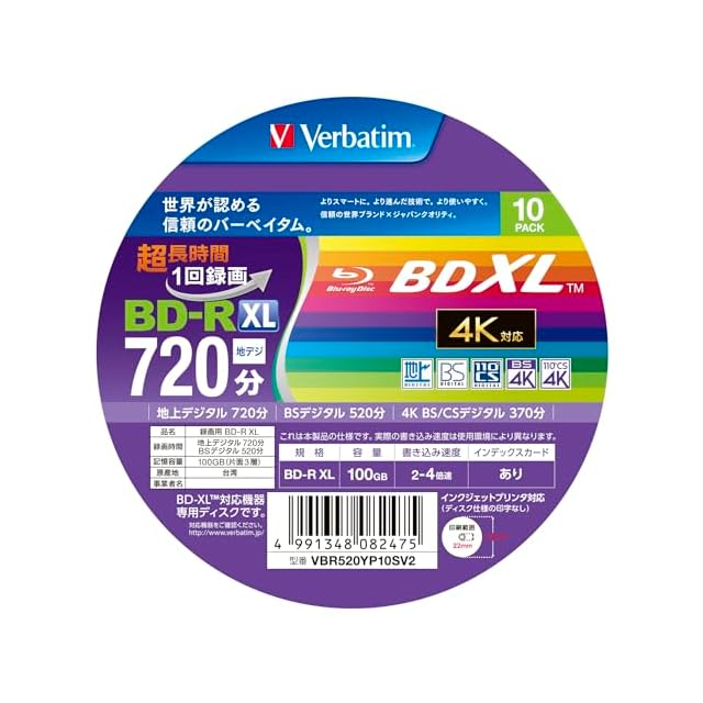 バーベイタム(Verbatim) Verbatim バーベイタム 1回録画用 ブルーレイディスク BD-R XL 100GB 10枚 ホワイトプリンタブル 片面3層 2-4倍速 VBR520YP10SV2 | つむぎ屋