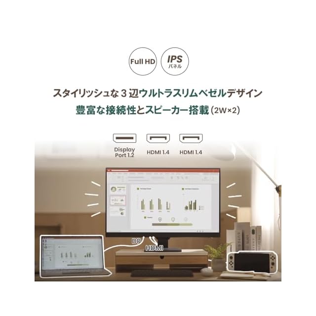 HDMIとDisplayPort接続端子を備え、スピーカー(2Wx2)を内蔵しているため、モニター単体でサウンドを再生できます。用途に合わせた8種の画面モード(標準、コーディング、ケアモード、M-book、動画、ゲーム、ePaper、ユーザー)搭載し、最適な色味に設定可能です。