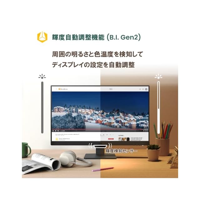 輝度自動調整機能(B.I. Gen2)を搭載し、環境の明るさを検知し、画面やコンテンツの輝度を自動調整。Gen2では、調整の起点となる明るさを調整し、お好みに合わせた明るさ設定が可能です。