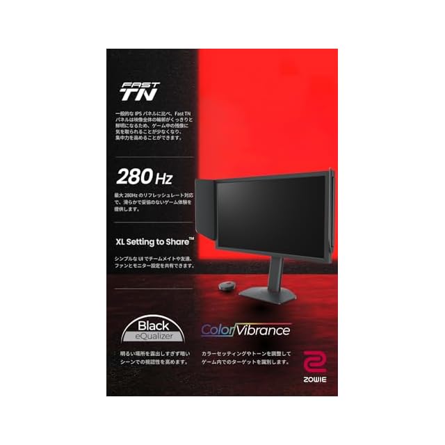 Full HD(1920×1080)解像度、4系統入力(HDMI 2.0×3、DisplayPort 1.2×1)、滑らかなゲームプレイを楽しめる280Hzリフレッシュレート。ゲーム内での激しいアクション効果を軽減して、残像感を最小限に抑える、進化した独自技術DyAc 2技術搭載。プリセットされた3種のFPSモード搭載