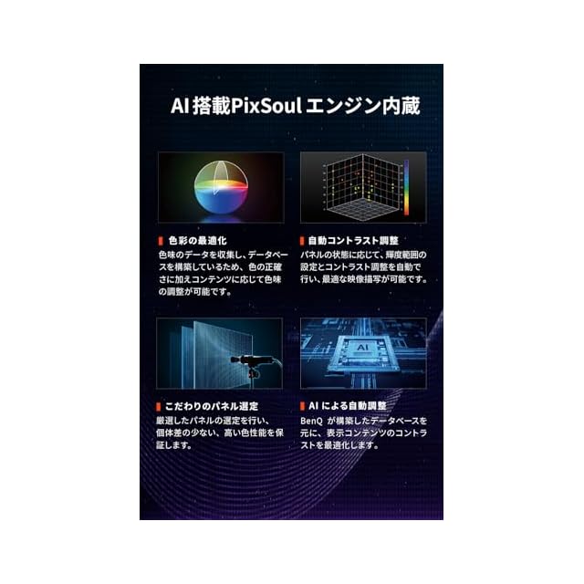 応答速度GtG 1msにより、なめらかな動画視聴やゲームプレイを実現。PixSoulエンジンを搭載、AIが独自のアルゴリズムに基づき、コンテンツや環境に合わせて色味を自動調整するShadow Phage機能