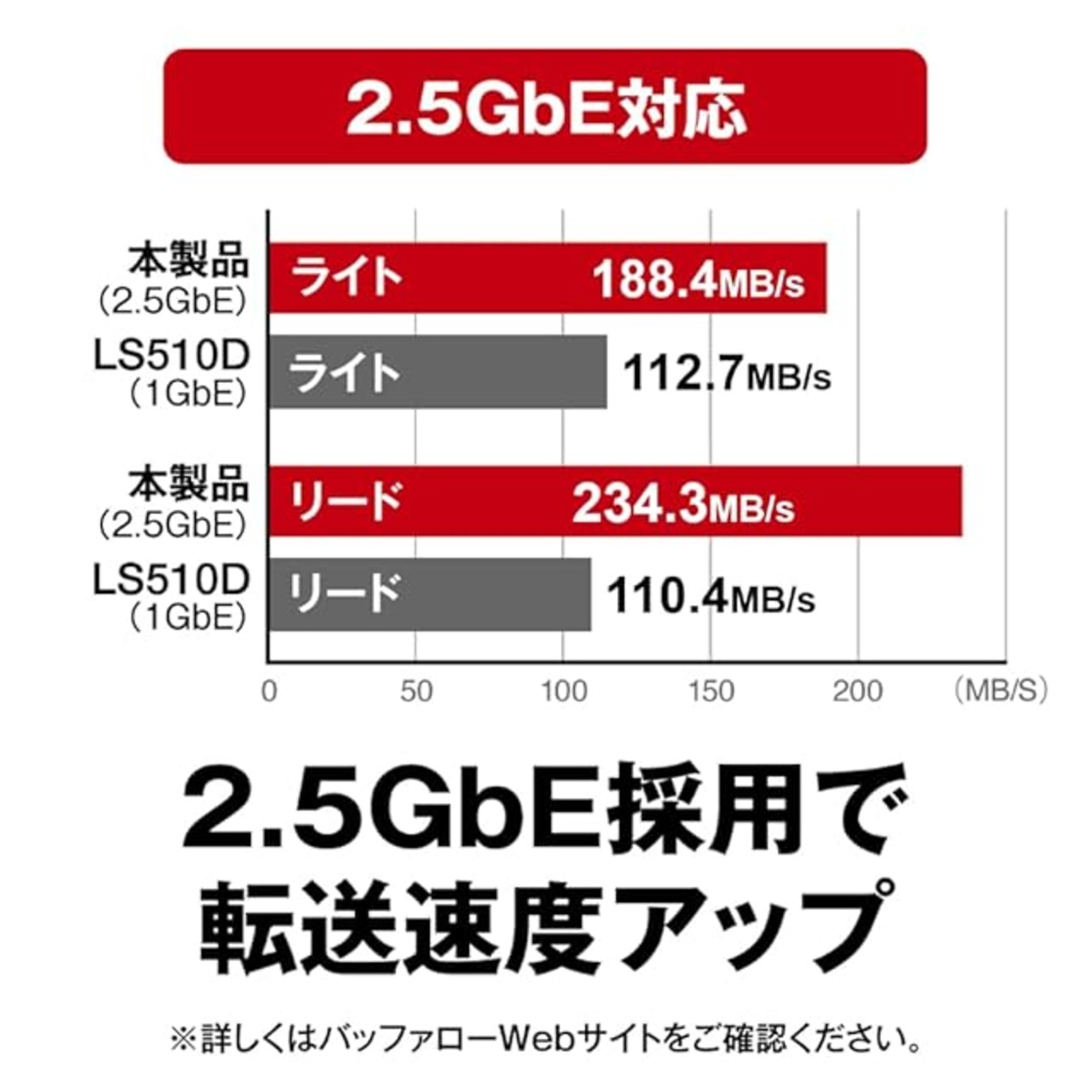 【インターフェース】2.5GBASE-T/1000BASE-T/100BASE-TX/10BASE-T(AUTO-MDIX対応)【ポート数】1※AUTO-MDIX対応【コネクター形状】RJ-45型 8極【搭載ドライブ】4TB