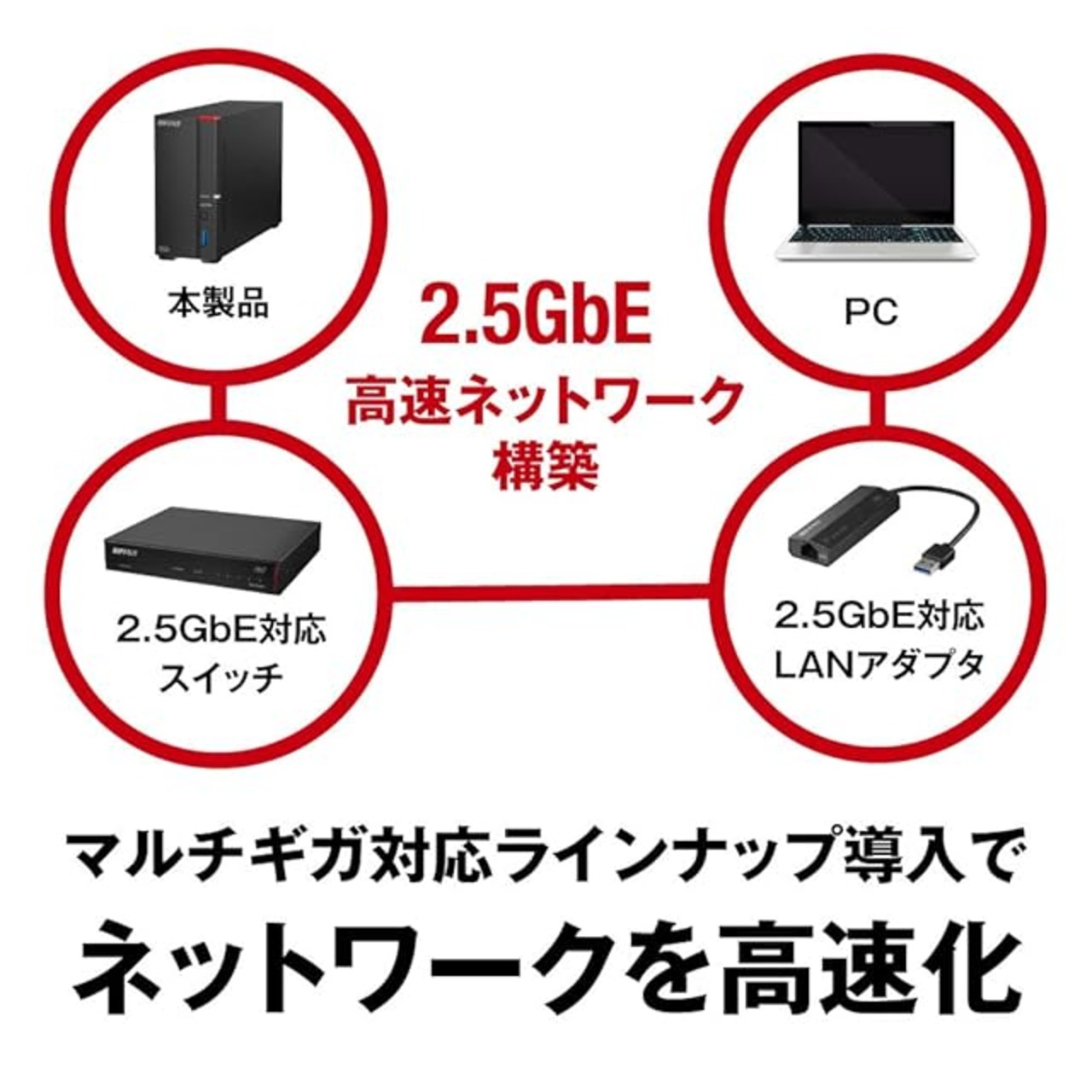 【インターフェース】2.5GBASE-T/1000BASE-T/100BASE-TX/10BASE-T(AUTO-MDIX対応)【ポート数】1※AUTO-MDIX対応【コネクター形状】RJ-45型 8極【搭載ドライブ】2TB
