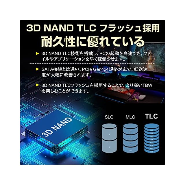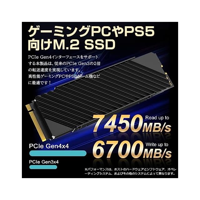 シーケンシャルリード(最大):7450MB/s、シーケンシャルライト(最大):6700MB/s ※ホスト機器、インターフェース、使用状況、その他の状況によって読み出し/ 書き込みの速度は異なる場合があります。