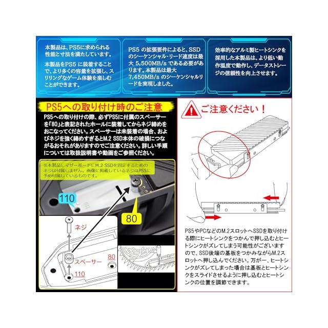 :安心の国内サポートとメーカー5年。※は、最初の購入日から5年間、または製品データシート上(取扱説明書)に記載されている最大書き込みバイト総数1500Terabytesが書き込まれるまでのうち、いずれか早く到達する日まで有効です。※PS5への取り付けの際、必ずPS5に付属のスペーサーを「80」と表記されたホールに装着してからネジ締めを行ってください。スペーサーは未装着の場合、及びネジを強く締めすぎるとM.2 SSD本体の破損につながる恐れがあります。 ※PS5やPCなどのM.2スロットへSSDを取り付ける際にヒートシンクをつかんで押し込むとヒートシンクがズレてしまう可能性がございますので。SSD後端の基板をつかみながらM.2スロットへ押し込んでください。※本製品にマザーボードにM.2 SSDを固定するためのネジは付属しません。