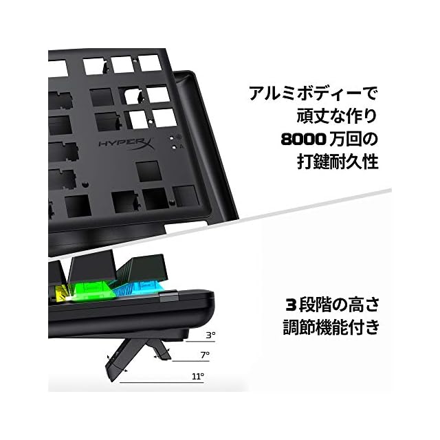 HyperX NGENUITYソフトウェアによる高度なカスタマイズ、3段階のキーボード角度と着脱式のUSB-Cケーブル