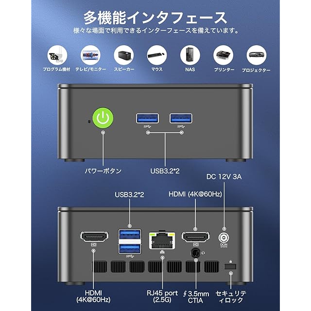 【次世代Wi-Fi 6&2.5G有線LAN安定した接続性】GMKtec 小型パソコンWi-Fi 6対応により、従来よりも約3倍高速な通信を実現。さらに、2.5G有線LANポートを搭載しており、高速で安定したインターネット接続を提供します。大容量データ転送や低遅延が求められる作業もスムーズに行えます。また、Bluetooth 5.2に対応し、複数のデバイスを同時接続可能です。