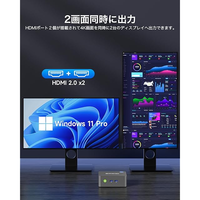 【4Kデュアルディスプレイ対応】Intel N150初登場 小型PC HDMI 2.0ポートを2基搭載し、最大4096×2160@60Hzの高解像度で2台のモニターに同時出力が可能。ビジネスの生産性向上やエンターテインメント体験の充実に役立ちます。最新のIntel UHD Graphicsでスムーズなグラフィック処理を実現。