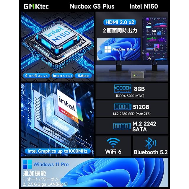 【ミニpc Intel N150初登場】 GMKtec G3 Plus 動作より安定最大3.6GHz mini pc 4コア/4スレッド DDR4 8GB SSD 512GB 4TB拡大可能 TDP 6W省電力小型PC 高速2.5G有線LAN/WIFI6/BT5.2/4K 静音 高速熱放散 豊富なインターフェース USB3.2×4/HDMI×2 小型パソコンWindows 11 Pro