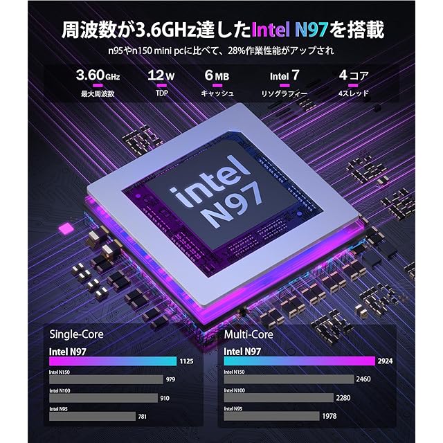 1.【N150より効率的な作業に、N97ミニPCが登場】高性能なコアで構成されたCPU:Alder Lake-N97が搭載。4コア4スレッド、クロック周波数2.00 GHz (最大3.60GHz)、6Mキャッシュの機能を持たせる。従来のn150やn95 mini pcに比べて28%作業性能がアップされ。GPUに関しては、 UHD Graphics 24 EUsが搭載して、周波数は1.20GHzがあり、画像処理はよりスムーズで、再生速度もより高速。4k 60Hz動画視聴・ブラウザ閲覧・文章作成など、この一台で簡単ケア!