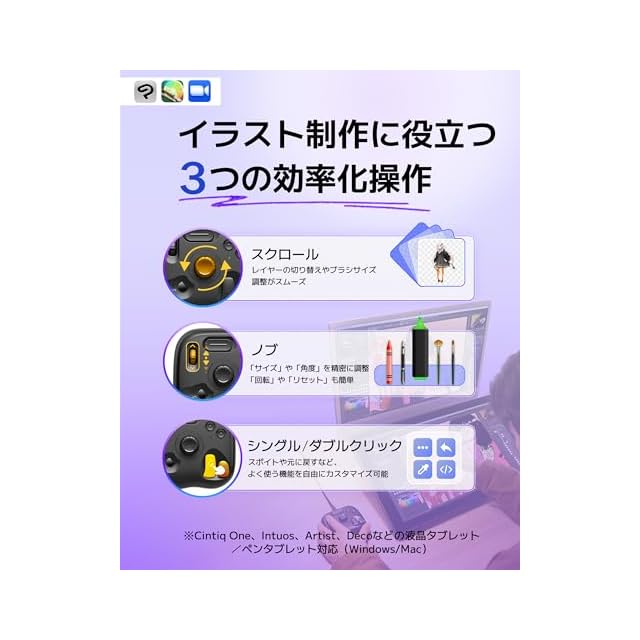 【イラストレーター向け3つの操作】 ホイールでブラシやレイヤーを瞬時に切り替え 、ダイヤルでキャンバスの拡大/縮小/回転/リセット、 カスタムボタンでスポイトや元に戻すを即操作。Cintiq、Artist、Intuosシリーズ対応。