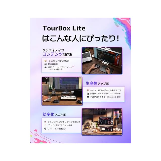 【もうキーボード操作に悩まない】TourBox Liteはすべての創作ワークフロー向けに設計されており、よりスマートに作業をコントロール。キーボードショートカット探し不要、左手だけでブラインド操作、視線は画面に集中。