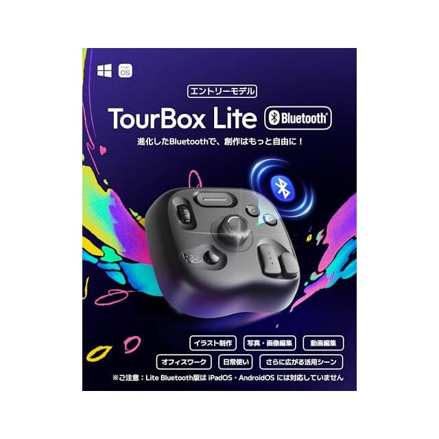 【パッケージ内容】本体 (TourBox Lite Bluetooth 2025) ×1、USBケーブル ×1、専用キャリーケース ×1、クイックスタートガイド ×1。【対応デバイス/OS】Mac:macOS 10.13以降、Windows:Windows 7以降(64bit)※ご注意:Lite Bluetooth版は iPadOS・AndroidOS には対応していません