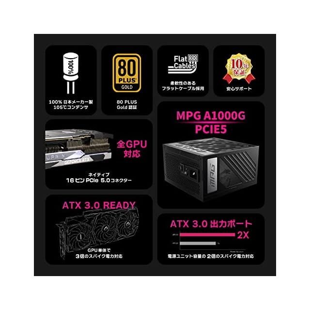 MSI MPG A1000G PCIE5 1000W ATX3.0/PCIe 5.0ネイティブ対応80PLUS GOLD PC電源ユニット PS1232