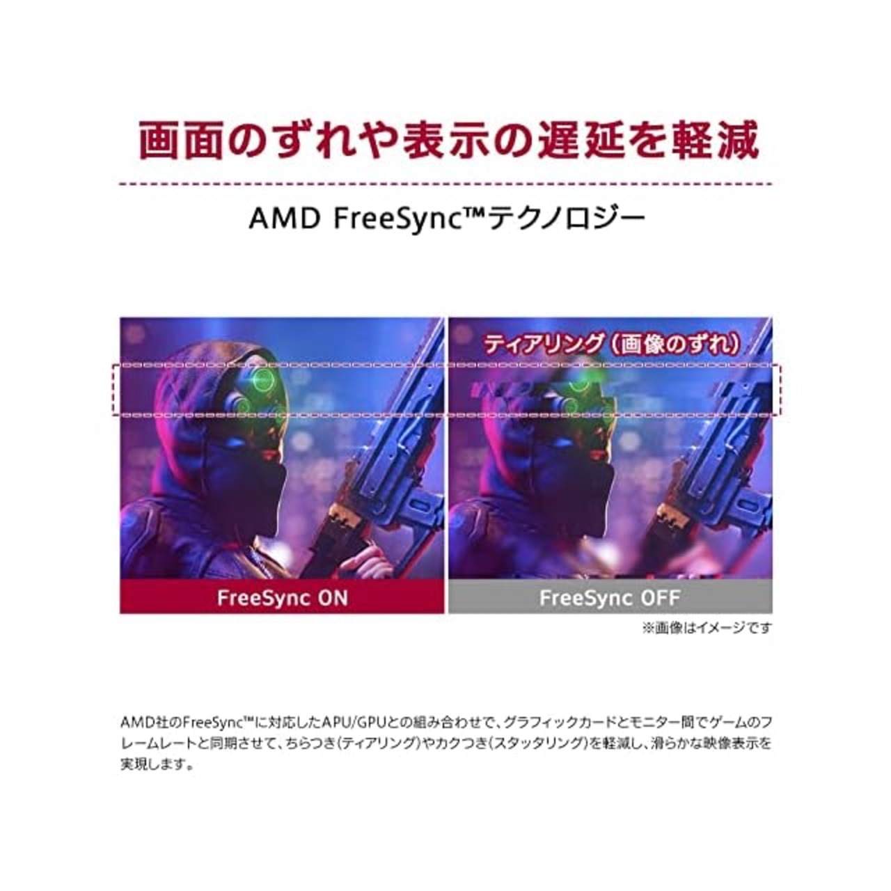 ティアリングやスタッタリングを抑えるAMD FreeSyncテクノロジーや、フレーム間の黒挿入により画面をくっきり表示させる1ms Motion Blur Reductionにも対応