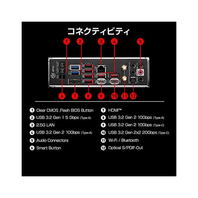 USB3.2 Gen2x2(20Gbps) Type-Cをリアパネルに1ポート、Gen2(10Gbps) Type-Cをフロントに1ポート、Type-Aをリアに3ポート搭載、高い利便性と高速接続を両立します。