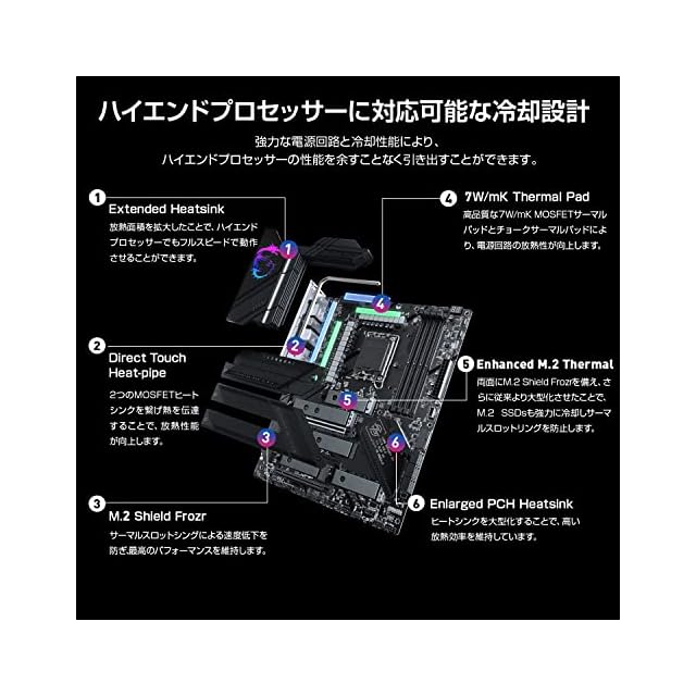 優秀な冷却能力を発揮する大型ヒートシンクとM.2 Shield Frozrを備え、システムが長時間高負荷状態でも安定動作を実現します。