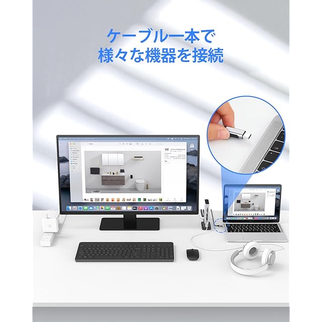 【省スペース・一括配線】縦置きにすると、設置面積はわずか5cm*9cmしかありませんので、デスク上のスペースを有効に活用することができます。一度接続したまま長く使い続けるポートが全て後ろに配置されており、長すぎる乱雑なケーブルをキレイに収納して、デスク環境をすっきりにします。急に出張や会議になった時には、ケーブル1本を抜けばパソコンを簡単に目的地へ持ち出せます。また使う時もケーブル1本を挿せば外部モニター、外付けHDD、マウス、キーボードなどをすぐに使用できます。