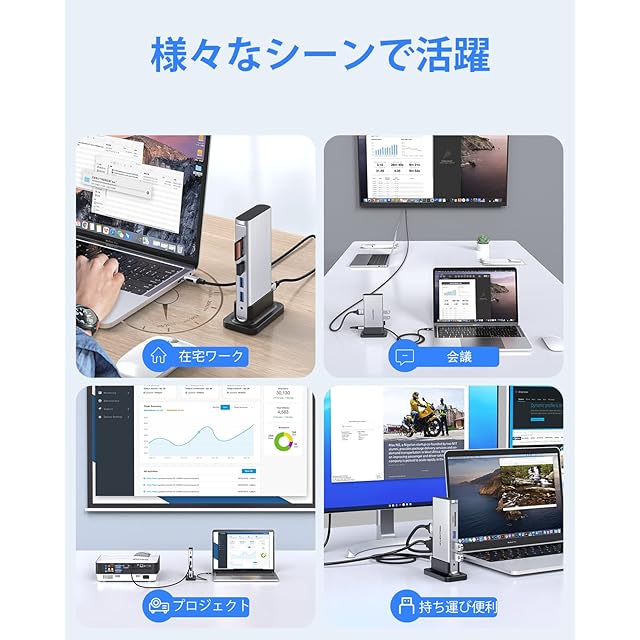 【省スペース・一括配線】縦置きにすると設置面積はわずか5cm*9cmだけで、机の占有を最小限にします。一度接続したまま長く使い続けるポートが全て後ろに配置されており、長すぎる乱雑なケーブルをキレイに収納して、デスク環境をすっきりにできます。急に出張や会議になった時には、ケーブル1本を抜けばパソコンを簡単に目的地へ持ち出せます。また使う時もケーブル1本を挿せば外部モニター、外付けHDD、マウス、キーボードなどをすぐに使用できます。