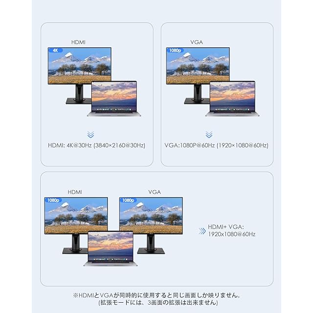 【高画質の複数画面出力】HDMIポートで最大4K@30Hz、VGAポートで最大1080P@60Hzの出力が可能で、拡張モードまたはミラーモードで画面表示できます。マルチディスプレイ環境に対応し、複数のディスプレイで画面の複製を行えます。ご注意:HDMIとVGAポートを同時に使用すると二つとも最大1920x1080@60Hzになります。