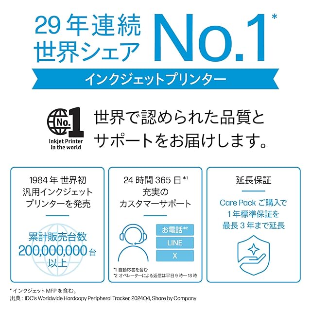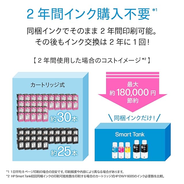 【特徴2】同梱インクがなくなっても1本あたりのお値段がお求めやすく、A4カラー文書の1枚当たりの印刷コストが、カートリッジ式HP ENVY 6020と比較して約96%も削減できます。黒色のインクには顔料インクを採用していて、水に濡れてもにじみにくいので、文書もくっきりキレイ。 プリント解像度 モノクロ:最高 1200×1200dpi、カラー:最高 4800×1200dpi