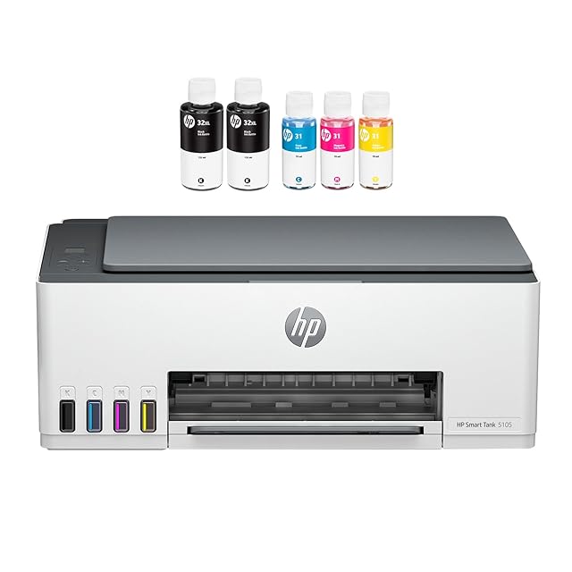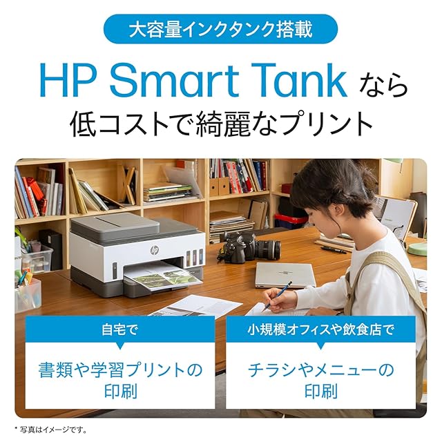 【特徴1】HP Smart Tankは大容量インクタンク式のプリンターです。最初の同梱インクが、顔料黒インク×2本・カラーボトル各色×1(CMY計3本)の5ボトル。同梱インクボトルでA4モノクロ12,000枚/A4カラー6,000枚の印刷が可能です。