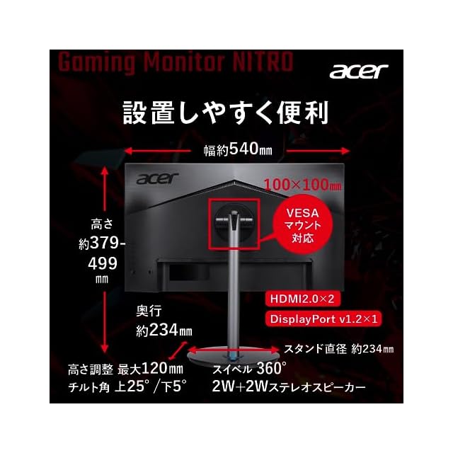 日本エイサー Acer Nitro ゲーミングモニター 23.8インチ IPS 非光沢 フルHD 180Hz 0.5ms HDMI 2.0 DisplayPort AMD FreeSync Premium HDR 10 VESAマウント対応 スピーカー内蔵 ヘッドホン端子 ピボット機能 高さ調整 XF243YM3bmiiprx PC/PS5/Xbox X/S向き | つむぎ屋