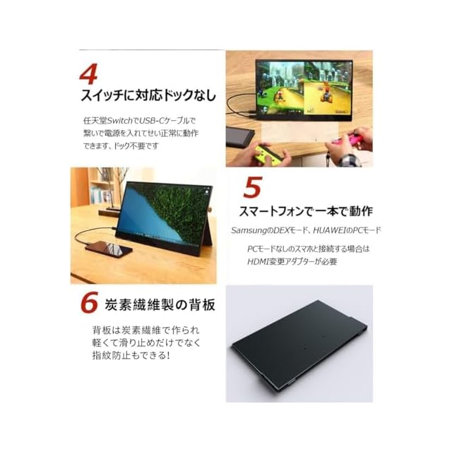 【多機種に対応】ノードパソコン、デスクトップ、スマホ、PS4、PS5、XBOX ONE、Wii又はNintendo Switchなどにも対応しています。USB Type-Cケーブル1つ或いはUSB Type-Cケーブル1つ+HDMIケーブル1つの組み合わせでデバイスとモバイルディスプレイを接続でき、いつでも仕事用、プレゼンテーション、ゲームや映画などに使える最高の相棒になります。