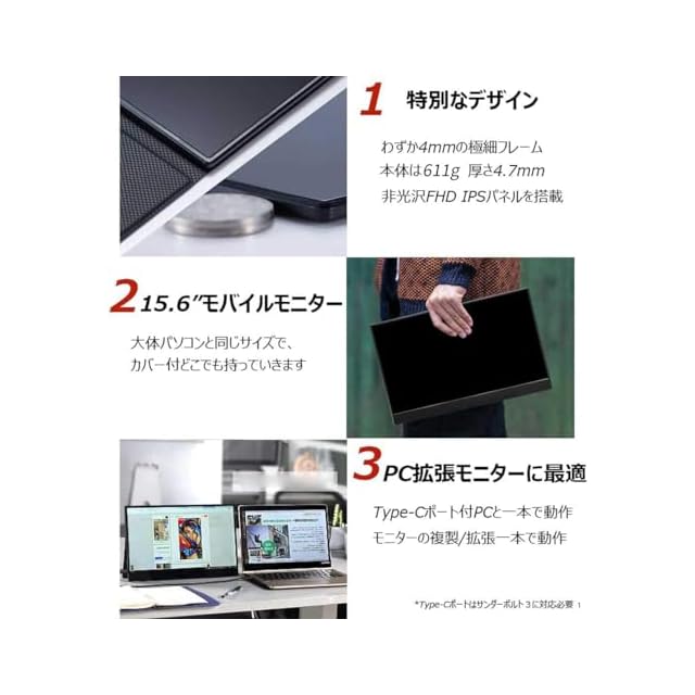 【洗練されたデザイン】①厚みは約9mm、左上右フレームは4mm、重量は僅かの720gで軽量なので、雑誌みたいのデザインでカバンに入れるとどこでも持ち運べます。下側に滑り止めゴムがつき、出張、旅行する時にも安定で、広い画面を楽しみながら作業できます。②ロゴなしの簡潔なデザインで、無駄なく、すっきりとした機能性をアピールします。③アルミ合金プレス成形で耐久性抜群。