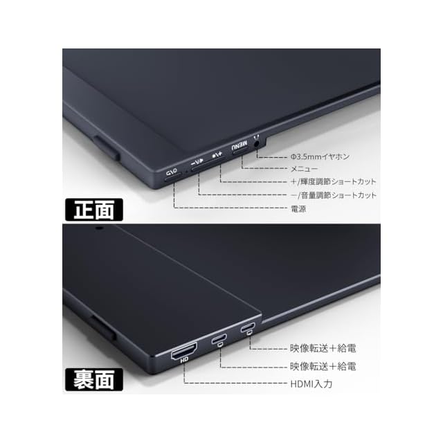 【多様な端子】①USB Type-C端子*2→同時に信号入力と給電に対応できます。HDMI端子*1→信号入力ができます。(HDMIケーブルで接続の場合、USB Type-Cケーブルによる給電が必要です)②Type-CとHDMI端子は全部右側にあります。Type-C端子は方向問わずに差し込めて便利です。HDMI端子の短い辺は液晶面に向き、長い辺は背面に向きます。ご注意:ソース入力しない場合は「信号なし」、「節電」がでます、これは正常です、HDMIケーブルでパソコンと繋いたら正常に表示されます、Type-C to Type-Cケーブル一本で接続する場合は①モニター付属しているType-C to Type-Cケーブルをご利用ください、②繋いでいるパソコンのType-Cポートは映像出力に対応することが必要です